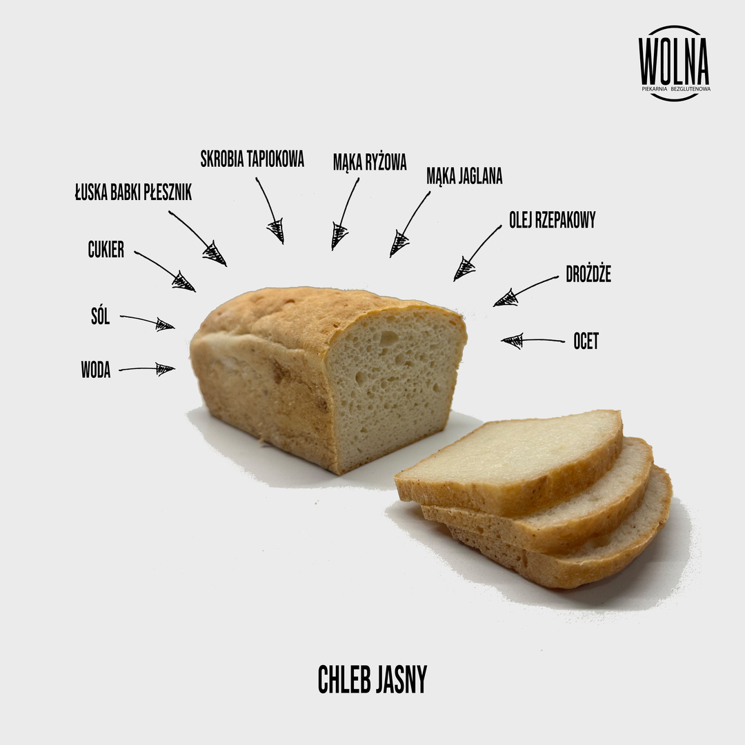 Składniki: mąka ryżowa, mąka jaglana, skrobia tapiokowa, łuska babki płesznik, drożdże, cukier, sól, woda, olej rzepakowy.