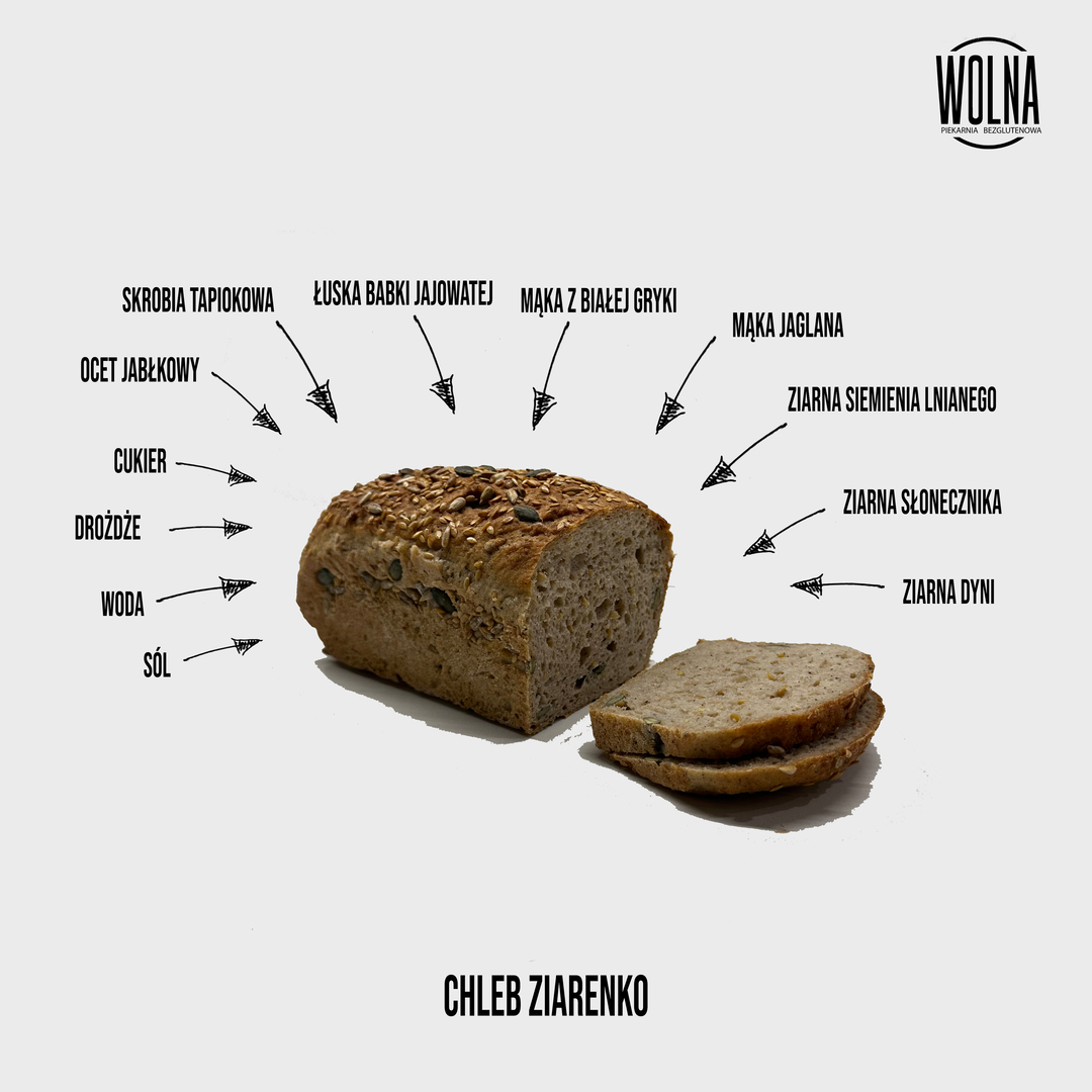 Składniki: mąką jaglana, mąka z białej gryki, skrobia ziemniaczana, łuska babki jajowatej, drożdże, cukier, sól, woda, ocet jabłkowy, pestki dyni, ziarno słonecznika, ziarno siemienia lnianego.